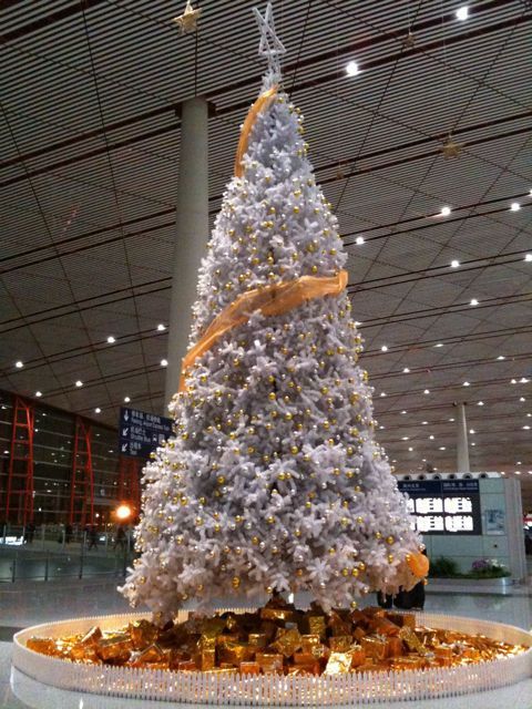 With presents in gold. At terminal 3 of Beijing Capital International Airport.