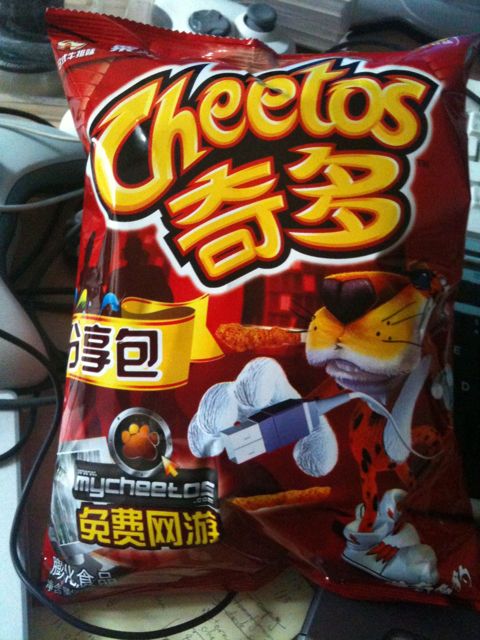 Found this at Carrefour — a bag of Japanese steak flavored Cheetos. The taste is actually not bad, with the cheese part supressed to a minimum.
