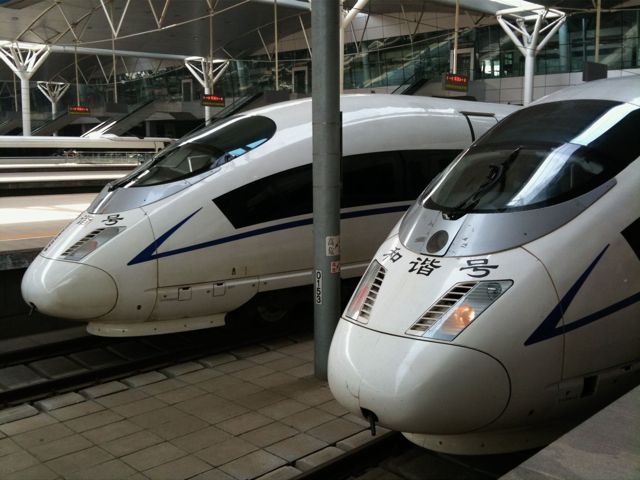 Taken on the Tianjin train station platform just after arrival from Beijing on the high-speed rail line. The train on the right is the one I took.