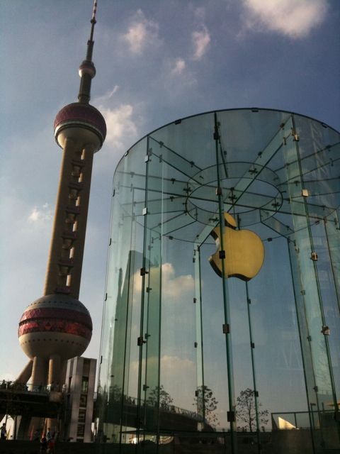 Had a chance to visit the new Shanghai Apple Store in Pudong. The glass cylindrical entrance is at the base of the new IFC complex, centered on a shallow pool.
